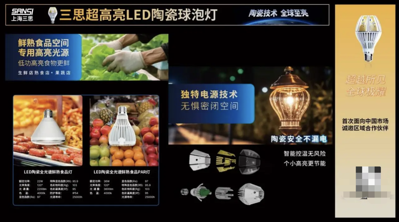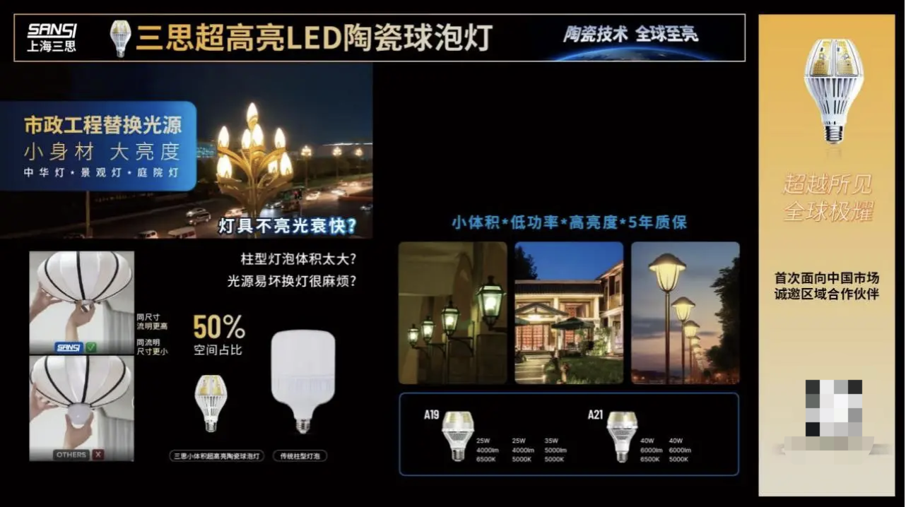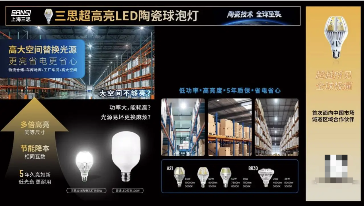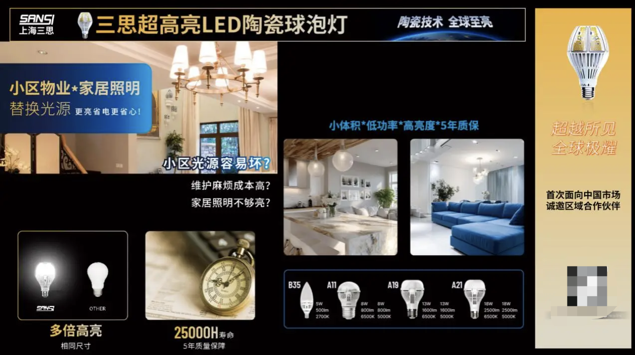 据上海三思市场总监宋定龙介绍,三思超高亮LED陶瓷球泡灯系列产品涵盖“极耀、极亮、极光、鲜亮”四大子系列,此次锚定光源产品四大主流应用场景的节能高亮光源替换,并推出“5年质保,只换不修”的坚定品质承诺。
