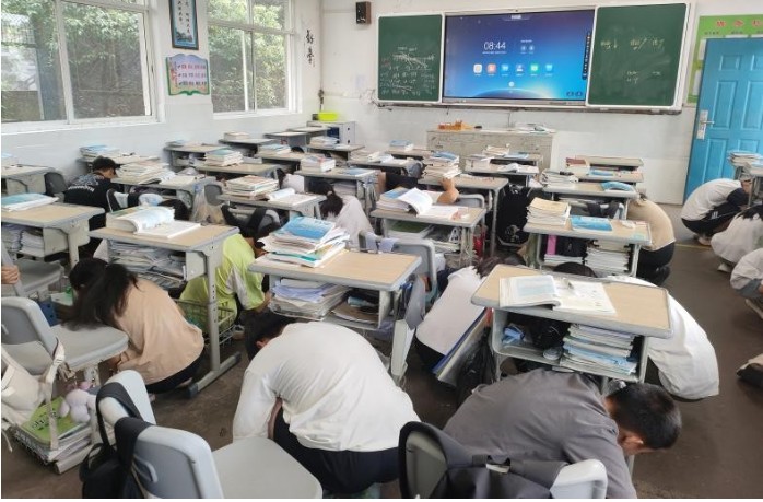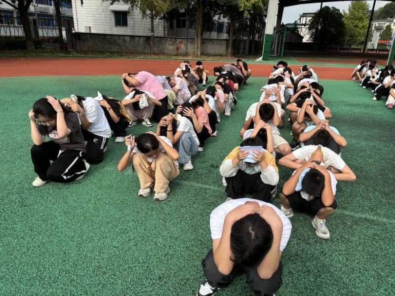 警报铃响,各班同学先在教室内按要求紧急避险。随后,各区域安全负责人立即组织学生按照预定的疏散路线,迅速有序向安全区域撤离。