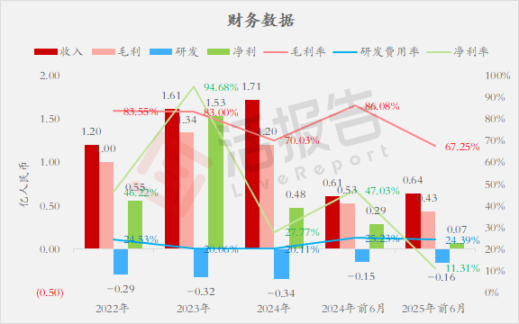 收入分别约为人民币1.20亿、1.61亿、1.71亿、0.61亿、0.64亿,2025年前6月同比+4.50%;