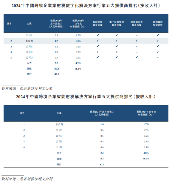 根据弗若斯特沙利文(Frost & Sullivan)报告,于2024年,公司在中国跨境企业智能财税解决方案市场排名第1(按收入计),市场份额为1.7%,在中国跨境企业财税数字化解决方案市场排名第2(按收入计),市场份额为1.2%。