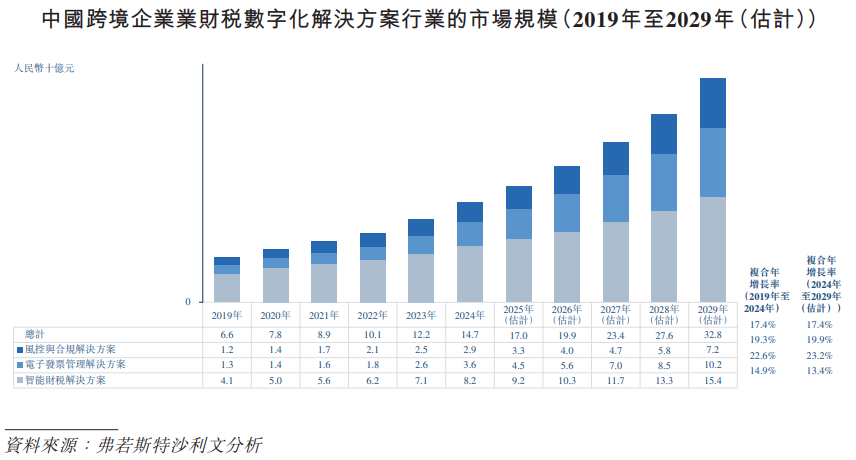 根据弗若斯特沙利文(Frost & Sullivan)报告,中国跨境企业业财税数字化解决方案行业的市场规模从2019年的人民币66亿元增长至2024年的人民币147亿元,复合年增长率为17.4%。预计到2029年,市场规模达到人民币328亿元。
