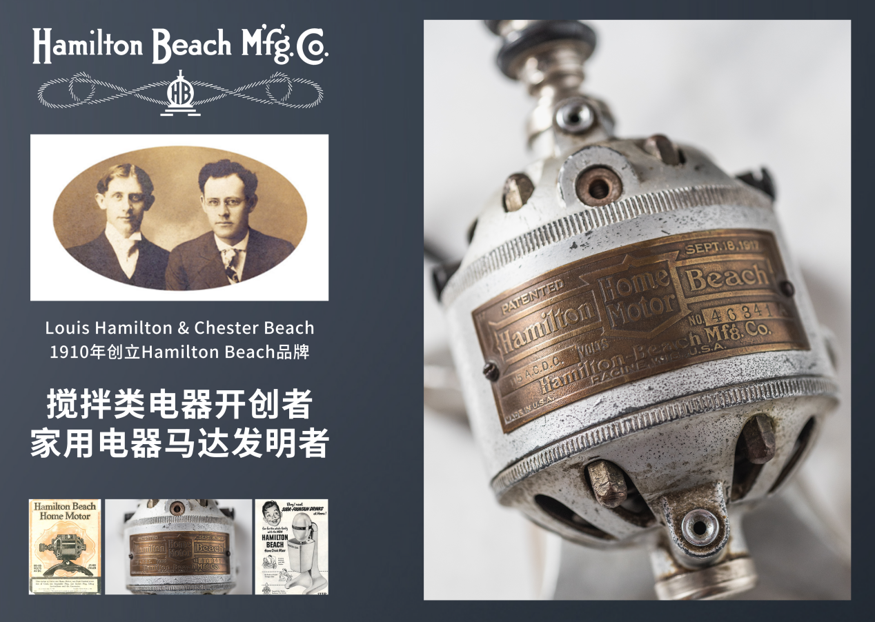 汉美驰Hamilton Beach品牌创立于1910年,是由创始人Louis Hamilton先生与Chester Beach先生的姓氏命名,他们是最早发明交直流通用电机的两名发明家,打造出人类历史上第一台电动食物搅拌机,开创搅拌电器品类,奠定了汉美驰Hamilton Beach品牌在厨房小家电领域的领先地位。一百余年来,汉美驰Hamilton Beach坚持以“不断改善人们日常生活”为初心,在技术研发与产品创新上持续突破,斩获多项国际设计大奖与专利认证。