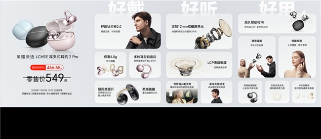 11月24日,荣耀500系列新品发布会重磅举行,正式发布荣耀亲选LCHSE耳夹式耳机2 Pro(以下简称为荣耀耳夹耳机2 Pro)。荣耀耳夹耳机2 Pro在外观设计、佩戴舒适度、音质表现、续航能力、交互体验及AI翻译等方面带来全方位越级体验,是同档位综合性能最均衡的耳夹耳机。荣耀耳夹耳机2 Pro于11月27日10:00全渠道正式开售,国补到手价466.65元。