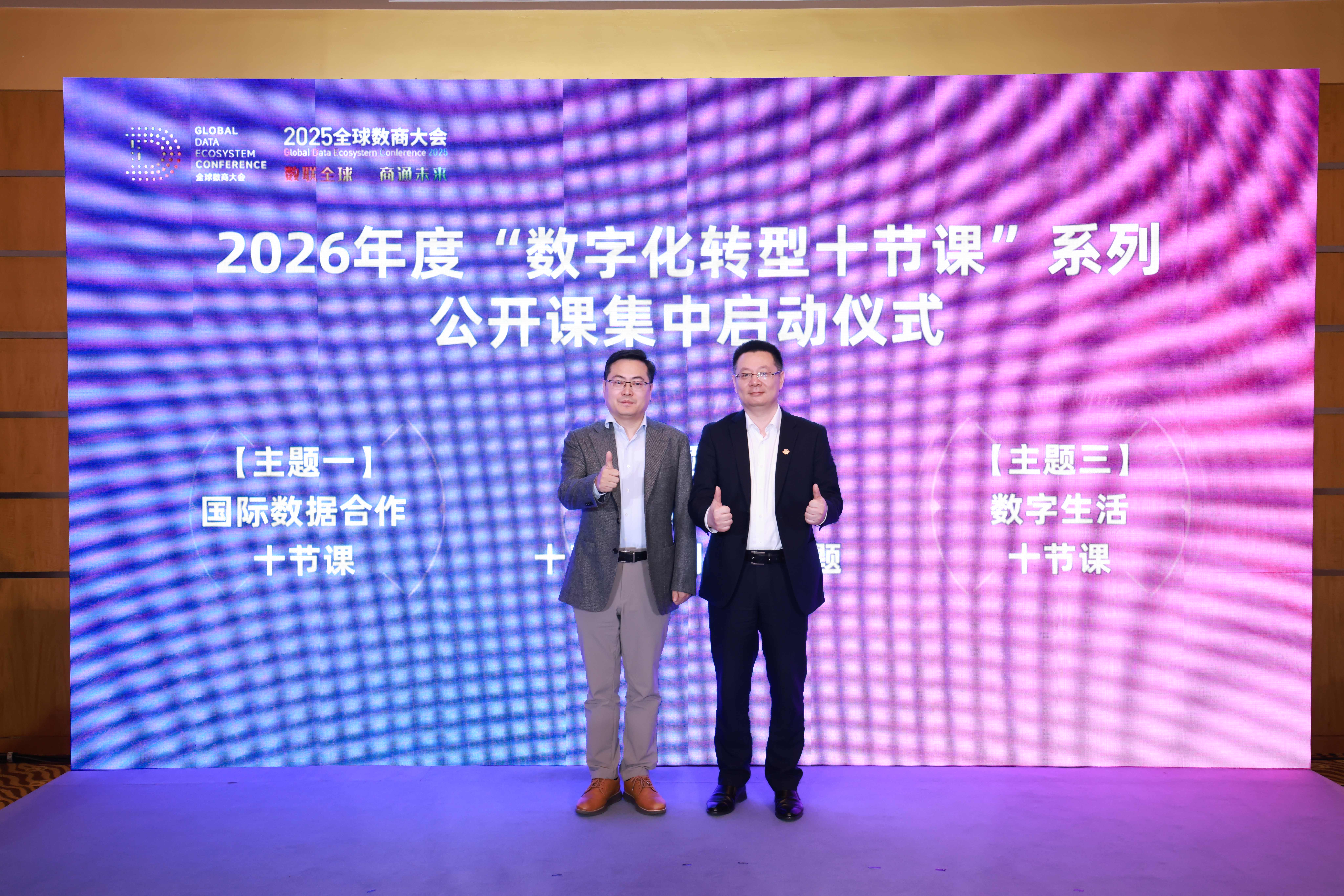 仪式环节,由上海联通智慧城市事业部总经理顾成大与上海智慧城市发展研究院院长盛雪锋携手启动的“2026 年度‘数字化转型十节课’系列公开课”,成为全场瞩目的焦点。系列公开课聚焦“国际数据合作”“数字生活”“数字上海十五五规划”三大前沿领域,旨在通过系统化、专业化的知识传授,以课程为桥梁,以人才为基石,为数字化进程中的关键难题提供破解思路,为数字中国建设培育更多卓越的栋梁之才。