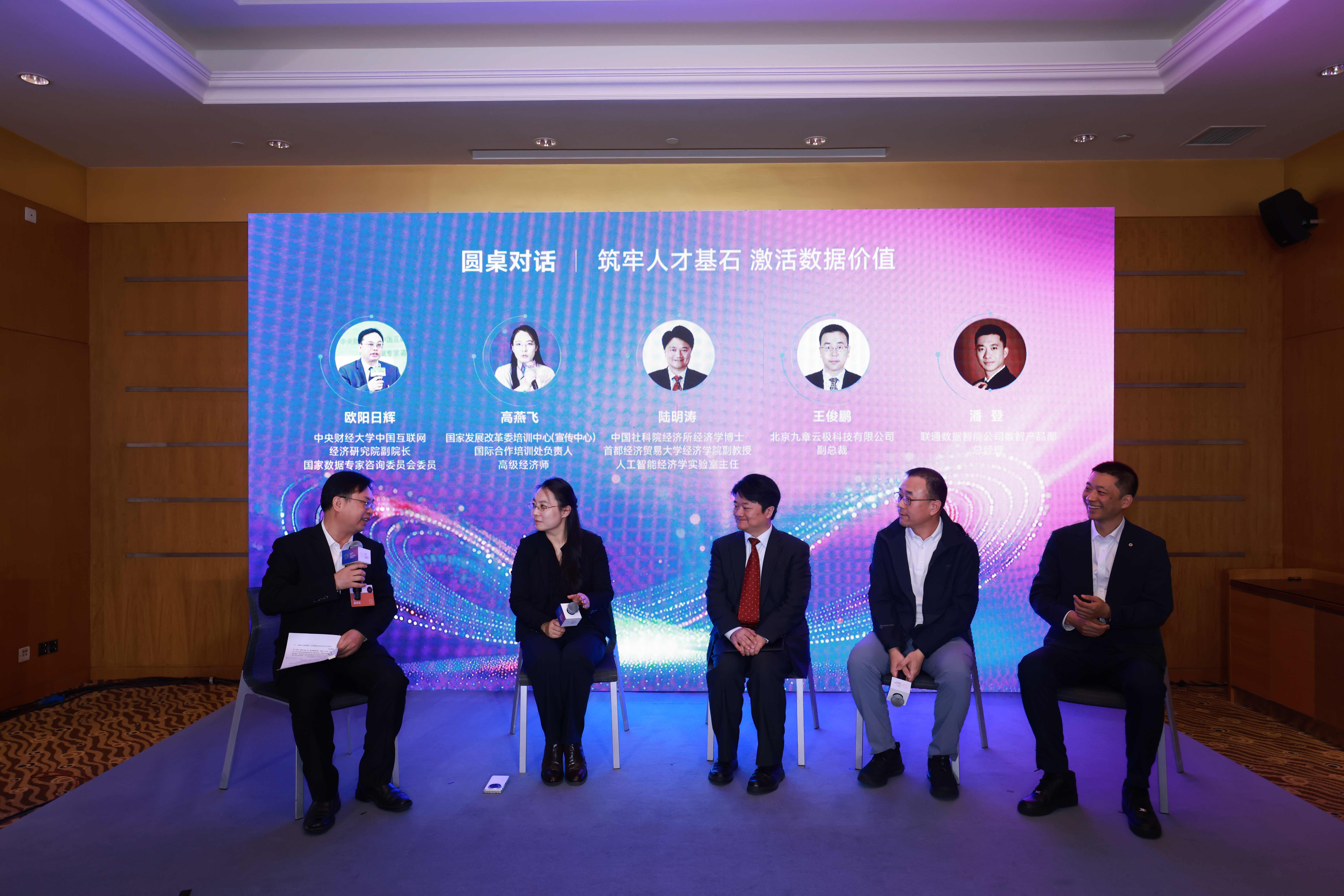 在欧阳日辉副院长主持下,五位圆桌对话嘉宾——国家发展改革委培训中心(宣传中心)国际合作培训处负责人、高级经济师高燕飞,中国社科院经济所经济学博士、首都经济贸易大学经济学院副教授、人工智能经济学实验室主任陆明涛,北京九章云极科技有限公司副总裁王俊鹏,联通数据智能公司数智产品部总经理潘登,围绕“筑牢人才基石,激活数据价值”,就数智时代人才与数据要素价值化协同发展的核心路径与关键支撑展开深度研讨,凝聚了关键共识。