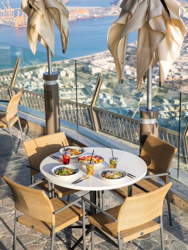 位于海拔580米的Al Suhub休息区(Al Suhub Rest Area),飞碟造型的建筑内藏着一家360度景观餐厅,可俯瞰豪尔法坎城景、阿曼湾与连绵群山。咖啡和餐厅连锁品牌Fen Café & Restaurant主打国际风味,迪巴湾烤海鲜、泰式冬阴功、日式鸡排咖喱饭、意式青酱贝壳面、炙烤和牛嫩角尖牛排及各类甜点饮品都让人意犹未尽。许多游客专程为一顿浪漫午餐或慵懒下午茶而来,吹着山风,面朝大海,整个人都被松弛感环绕。